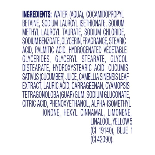 Water (aqua), Cocamidopropyl Betaine, Sodium Chloride, Sodium Lauroyl Glycinate, Sodium Lauroyl Isethionate, Acrylates Copolymer, Lauric Acid, Glycerin, Fragrance (parfum), Styrene/acrylates Copolymer, Stearic Acid, Dmdm Hydantoin, Bht, Sodium Isethionate, Peg-150 Pentaerythrityl Tetrastearate, Ppg-2 Hydroxyethyl Cocamide, Tetrasodium Edta, Etidronic Acid, Methylisothiazolinone, Iodopropynyl Butylcarbamate, Propylene Glycol, Citric Acid, Yellow 5 (ci 19140), Blue 1 (ci 42090).