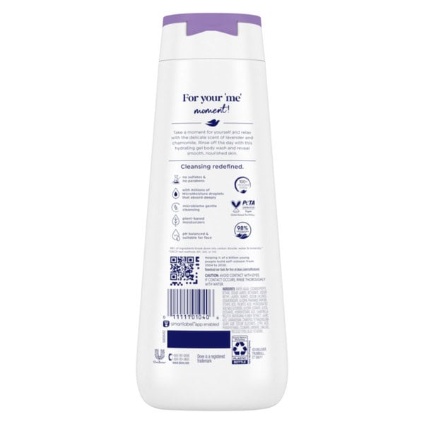 Screens down, power down, wind down. When you spend the day focused on everyone else, you deserve a little ‘me’ time. Dove Relaxing Lavender Oil & Chamomile Body Wash does just what it says – relaxes your mind and body as it gently cleanses and nourishes your skin. Find your inner calm from the tranquil chamomile and soothing lavender scent wrapped with a sleepy musky blanket. And while you chill out, the hard-working formula with millions of 24hr Renewing MicroMoisture️droplets, skin-natural nourishers and skin-loving plant-based moisturizers that are specifically designed to absorb deeply and work with your skin’s natural renewal process will help retain and boost moisture. For skin that’s nourished, soft, and smooth. As they should – you’ve done enough for the day. To use this hydrating gel formula, squeeze into palms or loofah, massage into skin, switch off, let the light, gel lather soak in, rinse and step out of shower feeling restored and silky-smooth all over. Who else would you trust, but the #1 dermatologist-recommended brand (us!) to deliver a long-lasting, hydrating body wash? Our Relaxing Lavender Oil & Chamomile Body Wash is vegan and Dove is PETA approved, meaning we do not test on animals anywhere in the world. Plus, it’s sulfate-free, paraben-free, and packaged in 100% recycled bottles.