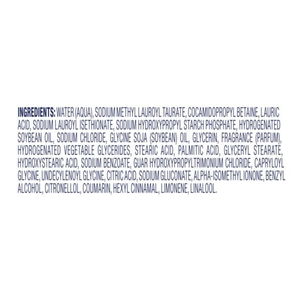 Water (aqua), Sodium Methyl Lauroyl Taurate, Cocamidopropyl Betaine, Lauric Acid, Sodium Lauroyl Isethionate, Sodium Hydroxypropyl Starch Phosphate, Hydrogenated Soybean Oil, Sodium Chloride, Glycine Soja (soybean) Oil, Glycerin, Fragrance (parfum), Hydrogenated Vegetable Glycerides, Stearic Acid, Palmitic Acid, Glyceryl Stearate, Hydroxystearic Acid, Sodium Benzoate, Guar Hydroxypropyltrimonium Chloride, Capryloyl Glycine, Undecylenoyl Glycine, Citric Acid, Sodium Gluconate, Alpha-isomethyl Ionone, Benzyl Alcohol, Citronellol, Coumarin, Hexyl Cinnamal, Limonene, Linalool.