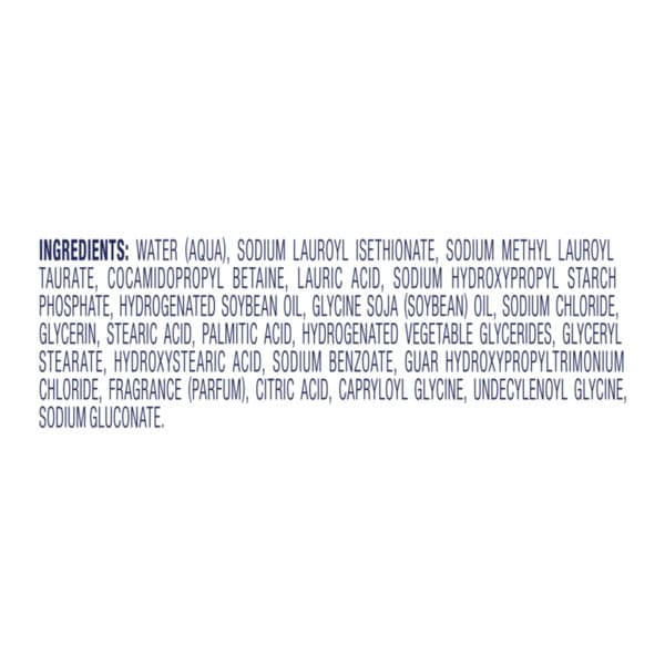 Water, Sodium Lauroyl Isethionate, Sodium Methyl Lauroyl Taurate, Cocamidopropyl Betaine, Lauric Acid, Sodium Hydroxypropyl Starch Phosphate, Hydrogenated Soybean Oil, Glycine Soja (soybean) Oil, Sodium Chloride, Glycerin, Stearic Acid, Palmitic Acid, Hydrogenated Vegetable Glycerides, Glyceryl Stearate, Hydroxystearic Acid, Sodium Benzoate, Guar Hydroxypropyltrimonium Chloride, Fragrance, Citric Acid, Capryloyl Glycine, Undecylenoyl Glycine, Sodium Gluconate