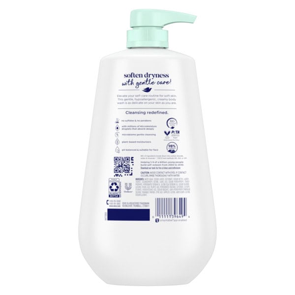 Having sensitive skin can be really…irritating. Making you wary of harsh ingredients that could trigger it. We get it! Our rich and creamy, hypoallergenic Dove Sensitive Skin Body Wash is here to wash away those concerns and leave you with soft, healthy-looking, and happy skin. The only reaction you can expect is a radiant, glowing review from your skin. It’s full of millions of teeny tiny 24hr Renewing MicroMoisture™️ droplets and plant-based moisturizers that gently cleanse and deeply nourish for skin that’s renewed and soft as silk. It’s a body wash that’s everything you need without the things you don’t. Like no sulfates and no parabens. Only green flags here to make sure your sensitive skin won’t be seeing red. Our hypoallergenic formula hypes up hydration and soothes dryness without irritation. That’s why it’s the #1 dermatologist-recommended brand. And we all know a derm is a sensitive skin wearer’s best friend. To use this rich, creamy body wash, squeeze into palms or loofah, massage onto skin, rinse, and step out of the shower feeling hydrated and renewed. Our Sensitive Skin Body Wash is vegan and Dove is PETA approved, meaning we do not test on animals anywhere in the world. Plus, it’s sulfate-free, paraben-free, and packaged in 100% recycled bottles.