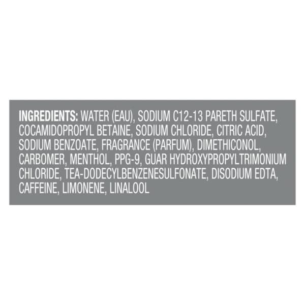 Water (aqua), Sodium Laureth Sulfate, Cocamidopropyl Betaine, Sodium Chloride, Fragrance, Dimethiconol, Menthol, Carbomer, Citric Acid, Tea-dodecylbenzenesulfonate, Guar Hydroxypropyltrimonium Chloride, Tetrasodium Edta, Dmdm Hydantoin, Caffeine Ppg-9, Methylchloroisothiazolinone, Methylisothiazolinone