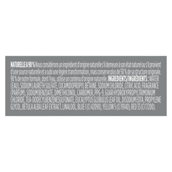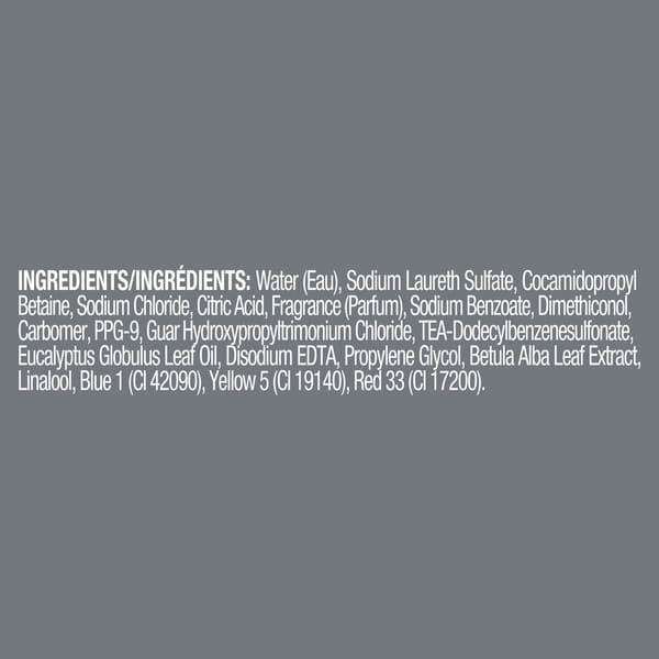 Water, Sodium Laureth Sulfate, Cocamidopropyl Betaine, Sodium Chloride, Citric Acid, Fragrance, Sodium Benzoate, Dimethiconol, Carbomer, Ppg-9, Guar Hydroxypropyltrimonium Chloride, Tea-dodecylbenzenesulfonate, Eucalyptus Globulus Leaf Oil, Disodium Edta, Propylene Glycol, Betula Alba Leaf Extract, Linalool, Blue 1 (ci 42090), Yellow 5 (ci 19140), Red 33 (ci 17200)