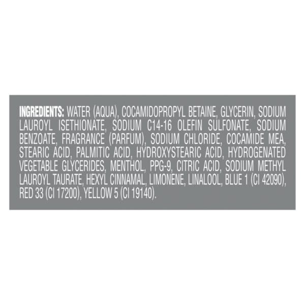 Water, Sodium Laureth Sulfate, Cocamidopropyl Betaine, Glycerin, Sodium Chloride, Fragrance, Acrylates Copolymer, Sodium Lauroyl Isethionate, Stearic Acid, Palmitic Acid, Menthol, Sodium Benzoate, Citric Acid, Tetrasodium Edta, Phenoxyethanol, Ppg-9, Iodopropynyl Butyl Carbamate, Hexyl Cinnamal, Limonene, Linalool, Yellow 5 (ci 19140), Blue 1 (ci 42090), Red 33 (ci 17200)