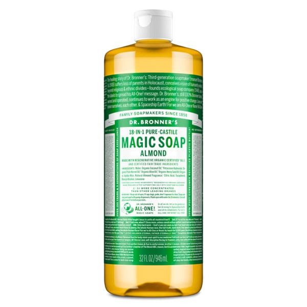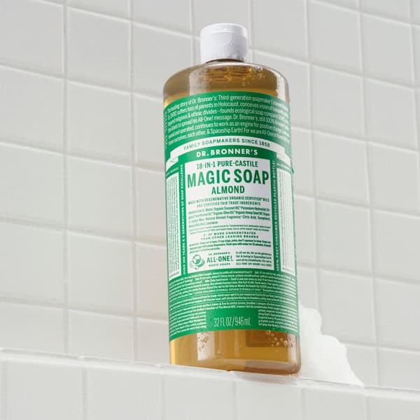 Dr. Bronner’s 18-in-1 Pure-Castile Soaps are multi-surface all-purpose cleaners good for just about any task. Wash face, body, hair, hands! Clean toilets, bathtubs, countertops, dishes—great for laundry, mopping, pets, and aromatherapy—with no synthetic preservatives, detergents or foaming agents—none!