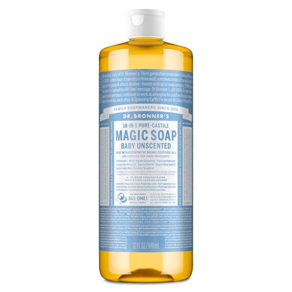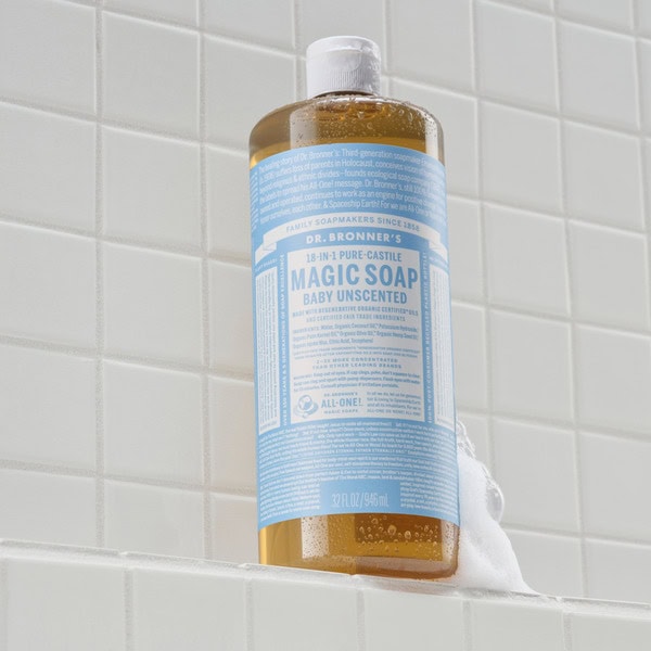 Dr. Bronner’s 18-in-1 Pure-Castile Soaps are multi-surface all-purpose cleaners good for just about any task. Wash face, body, hair, hands! Clean toilets, bathtubs, countertops, dishes—great for laundry, mopping, pets, and aromatherapy—with no synthetic preservatives, detergents or foaming agents—none!