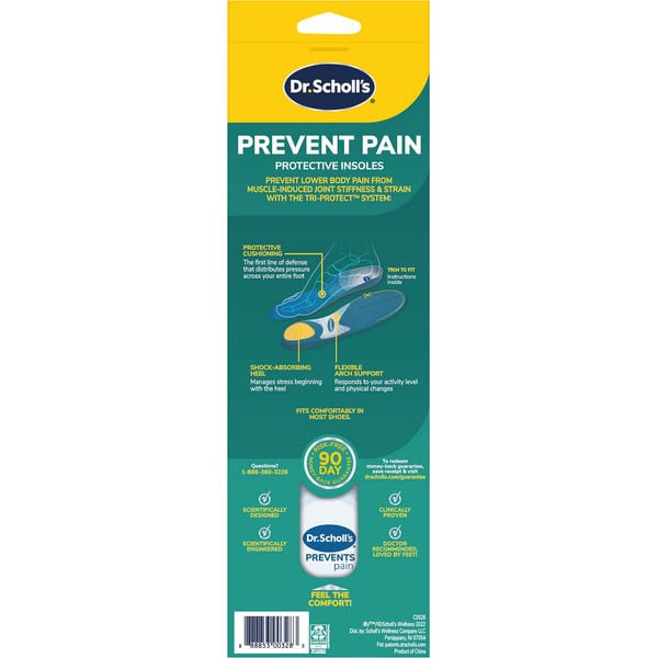 Instructions for Use Above: If your shoes’ insoles are removable, take them out first. 1) To test for size, place the Dr. Scholl’s insoles against the back of your removable insoles, lining up the heels of both. If needed, trim the new insoles to your shoe size, using the guide at the bottom of the Dr. Scholl’s insoles. If your shoes’ insoles can’t be removed, simply trim the Dr. Scholl’s insoles to your shoe size. 2) Slide the insoles into your shoes, toe area first, with the fabric side up. Make sure each insole lays flat against the bottom of your shoe, especially in the toe area, and that the insole heel rests firmly in the heel of your shoe. If the insole doesn’t fit without bunching, especially in the toe area, continue to trim as needed.