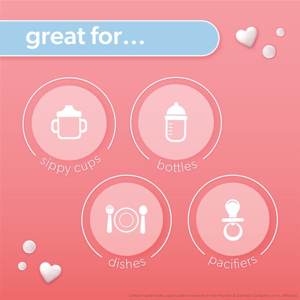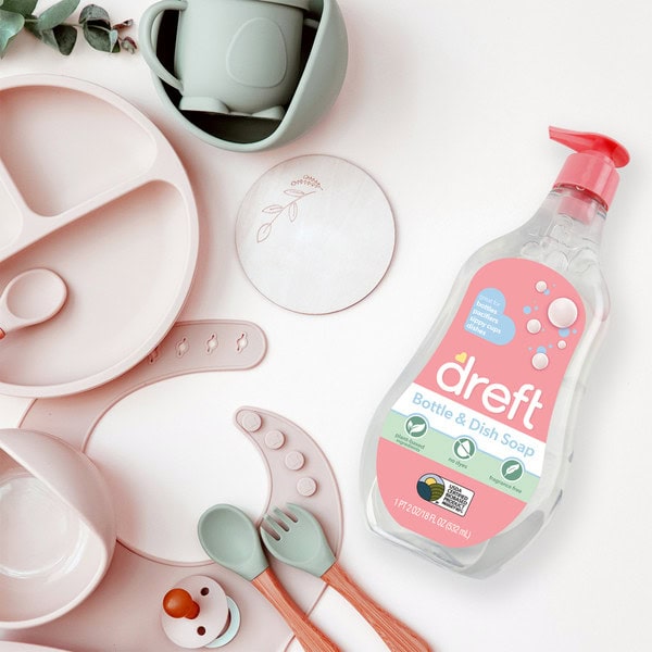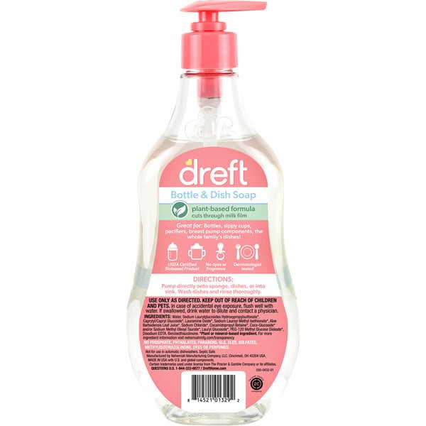 Perfect for new and experienced moms and dads, Dreft Baby, Bottle and Dish Soap cleans baby bottles, sippy cups, pacifiers, breast pump components, utensils, silicone bibs, whole family’s dishes and more! Great for removing milk film and odors while providing your baby a plant based, fragrance free and dermatologist tested product!