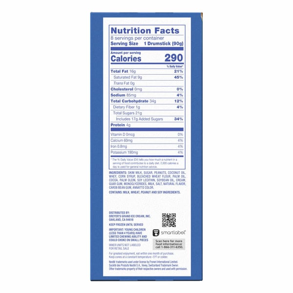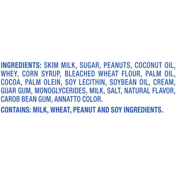 Dairy Product Solids, Sugar, Skim Milk, Corn Syrup, Peanuts, Bleached Wheat Flour, Coconut Oil, Cream, Maltodextrin, Palm Oil, Cocoa, Palm Olein, Reduced Minerals Whey, Propylene Glycol Monostearate, Soybean Oil, Soy Lecithin, Cellulose Gel, Guar Gum, Monoglycerides, Carob Bean Gum, Salt, Natural Flavor, Cellulose Gum, Milk, Chocolate, Annatto Color.