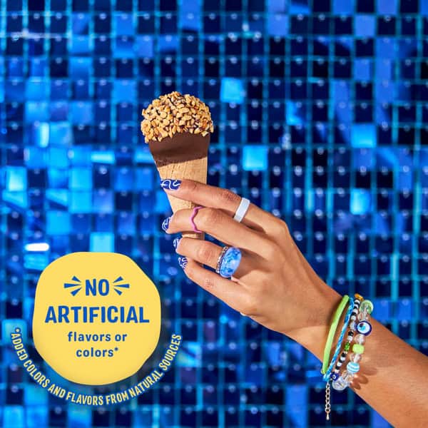 • Crispy sugar cone with creamy vanilla center and rich chocolatey coating with roasted peanuts