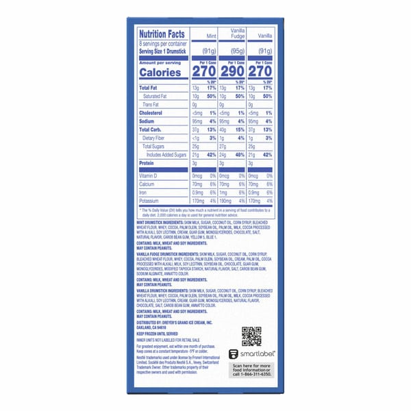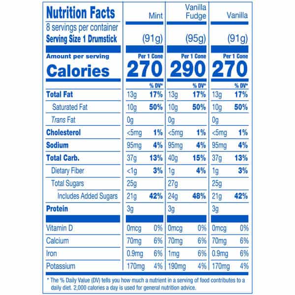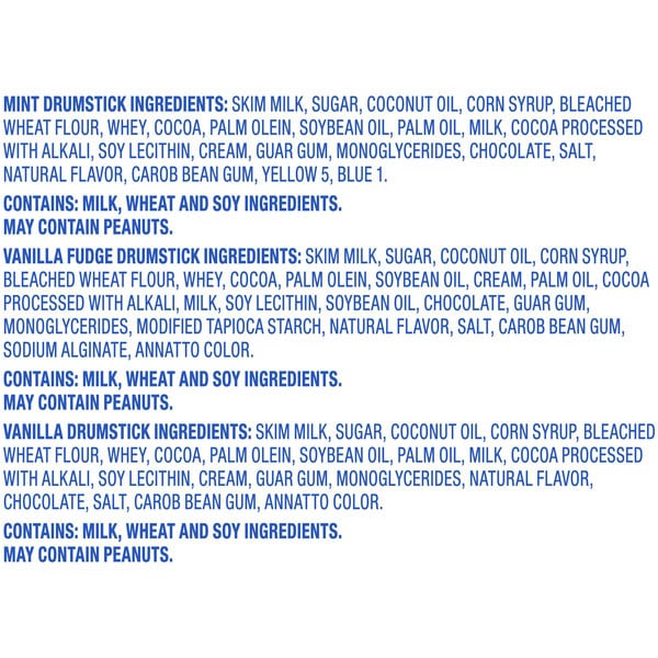 Mint – Mint Drumstick: Dairy Product Solids, Sugar, Skim Milk, Corn Syrup, Coconut Oil, Bleached Wheat Flour, Cream, Maltodextrin, Cocoa, Palm Olein, Soybean Oil, Whey, Palm Oil, Propylene Glycol Monostearate, Cocoa Processed With Alkali, Whole Milk Powder, Soy Lecithin, Guar Gum, Cellulose Gel, Monoglycerides, Carob Bean Gum, Natural Flavor, Chocolate, Salt, Cellulose Gum, Yellow 5, Blue 1.,vanilla Fudge – Vanilla Fudge Drumstick: Dairy Product Solids, Sugar, Skim Milk, Corn Syrup, Coconut Oil, Bleached Wheat Flour, Cream, Maltodextrin, Cocoa, Water, Palm Olein, Soybean Oil, Whey, Palm Oil, Cocoa Processed With Alkali, Propylene Glycol Monostearate, Whole Milk Powder, Soy Lecithin, Chocolate, Guar Gum, Cellulose Gel, Monoglycerides, Natural Flavor, Carob Bean Gum, Modified Tapioca Starch, Salt, Cellulose Gum, Sodium Alginate, Annatto Color.,vanilla – Vanilla Drumstick: Dairy Product Solids, Sugar, Skim Milk, Corn Syrup, Coconut Oil, Bleached Wheat Flour, Cream, Maltodextrin, Cocoa, Palm Olein, Soybean Oil, Whey, Palm Oil, Propylene Glycol Monostearate, Cocoa Processed With Alkali, Whole Milk Powder, Soy Lecithin, Guar Gum, Cellulose Gel, Monoglycerides, Natural Flavor, Carob Bean Gum, Chocolate, Salt, Cellulose Gum, Annatto Color.