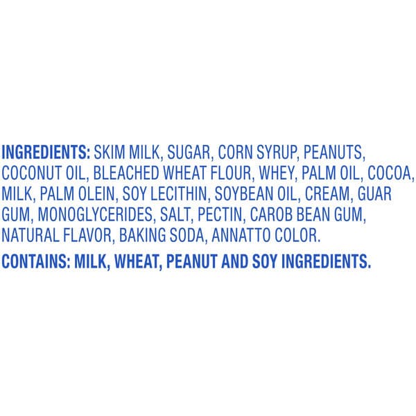 Dairy Product Solids, Skim Milk, Sugar, Corn Syrup, Peanuts, Bleached Wheat Flour, Coconut Oil, Cream, Water, Maltodextrin, Palm Oil, Sweetened Condensed Milk (condensed Milk, Sugar), Cocoa, Palm Olein, Reduced Minerals Whey, Propylene Glycol Monostearate, Soybean Oil, Soy Lecithin, Cellulose Gel, Guar Gum, Monoglycerides, Salt, Carob Bean Gum, Vanilla Extract, Cellulose Gum, Milk, Chocolate, Pectin, Natural Flavor, Baking Soda, Annatto Color.