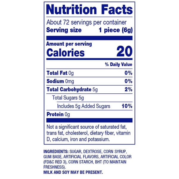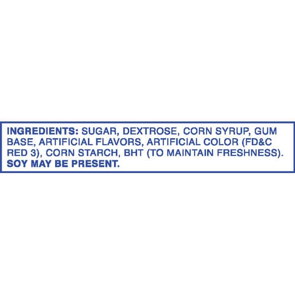 Sugar, Dextrose, Corn Syrup, Gum Base, Artificial Flavors, Artificial Color (fd&c Red 3), Corn Starch, Bht (to Maintain Freshness).