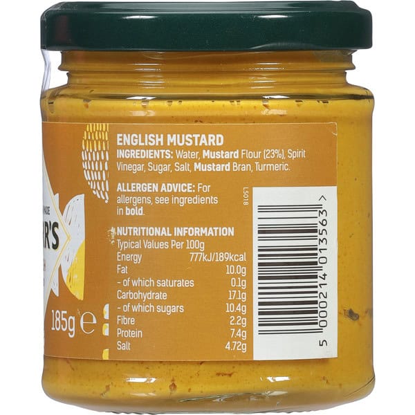 IngredientsWater, Mustard Flour (23%), Spirit Vinegar, Sugar, Salt, Mustard Bran, Turmeric.