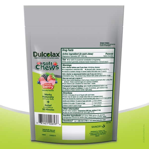 • Includes: One (1) 30-count bag of Dulcolax saline laxative mixed berry soft chews