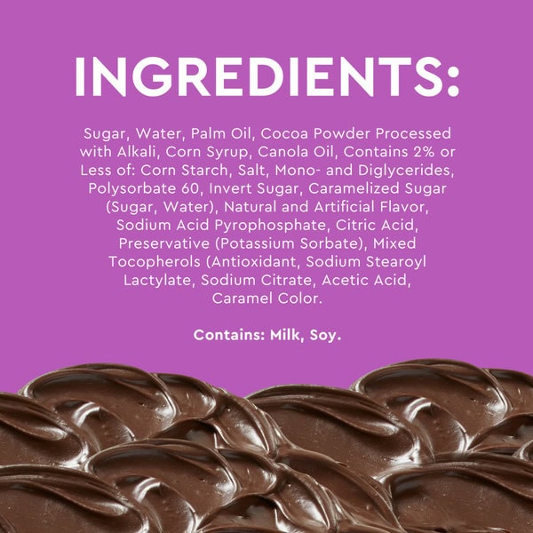 Sugar, Water, Palm Oil, Cocoa Powder Processed With Alkali, Corn Syrup, Canola Oil, Contains 2% Or Less Of: Corn Starch, Salt, Mono- And Diglycerides, Invert Sugar, Caramelized Sugar (sugar, Water), Natural And Artificial Flavor, Sodium Stearoyl Lactylate, Sodium Acid Pyrophosphate, Citric Acid, Preservative (potassium Sorbate), Antioxidants (ascorbyl Palmitate, Tocopherols, Chamomile And Rosemary Extract), Sodium Citrate, Acetic Acid, Caramel Color.