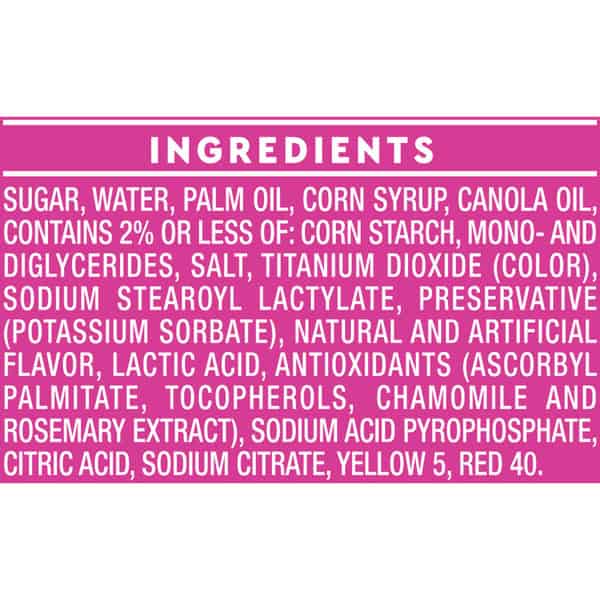 Sugar, Water, Palm Oil, Corn Syrup, Canola Oil, Contains Less Than 2% Of: Corn Starch, Mono- And Diglycerides, Salt, Titanium Dioxide (color), Polysorbate 60, Potassium Sorbate (preservative), Antioxidants (tocopherols, Ascorbyl Palmitate, Chamomile Extract, Rosemary Extract), Sodium Stearoyl Lactylate, Sodium Acid Pyrophosphate, Sodium Citrate, Citric Acid, Natural And Artificial Flavor, Lactic Acid, Yellow 5, Red 40.