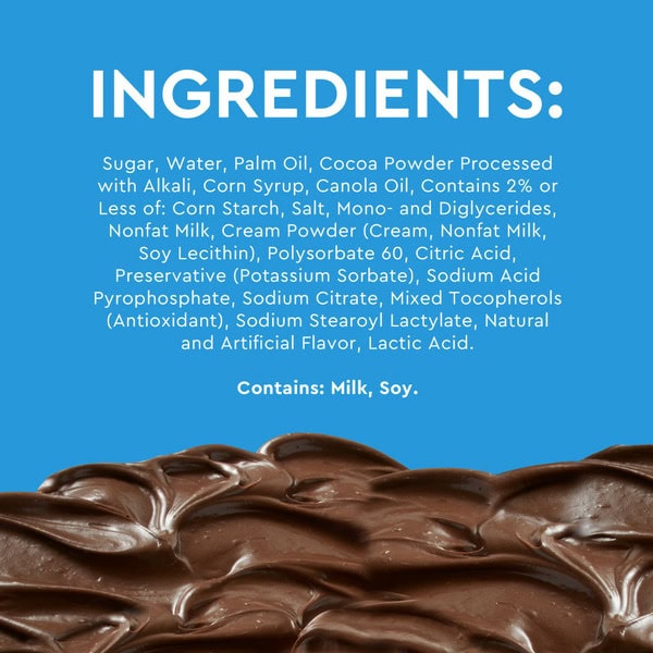 Sugar, Water, Palm Oil, Cocoa Powder (processed With Alkali), Corn Syrup, Canola Oil, Contains Less Than 2% Of: Corn Starch, Mono- And Diglycerides, Nonfat Dry Milk, Salt, Polysorbate 60, Cream Powder, Citric Acid, Potassium Sorbate (preservative), Sodium Citrate, Sodium Acid Pyrophosphate, Antioxidants (tocopherols And Ascorbyl Palmitate, Chamomile Extract, Rosemary Extract), Sodium Stearoyl Lactylate, Natural And Artificial Flavor, Lactic Acid.