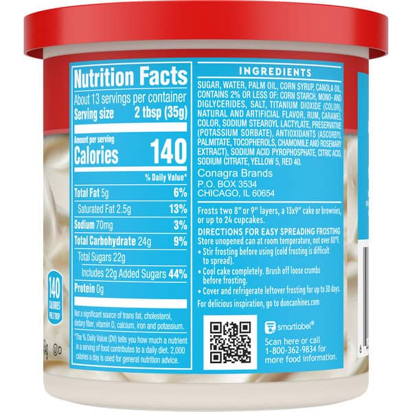 Duncan Hines Creamy Vanilla Frosting makes it easy to whip up irresistible treats. Its rich, creamy flavor satisfies your vanilla cravings. Perfect for any occasion, this frosting pairs well with chocolate, vanilla or fruit flavored desserts. Use as a chocolate or vanilla cake frosting, strawberry cupcake frosting, or dessert topping. This can of white frosting is enough to frost two 8 or 9 inch cake layers, a 13 x 9 inch cake or up to 24 cupcakes. Keep with your baking and cake decorating supplies to have on hand for any cookie decorating or cake decorating needs. Store the unopened can at room temperature and stir before use. Cover and refrigerate remaining frosting for up to 30 days. From whipped frosting, to single serve desserts, Duncan Hines has you covered when you’re ready to bake and create. Life is as sweet as you make it!