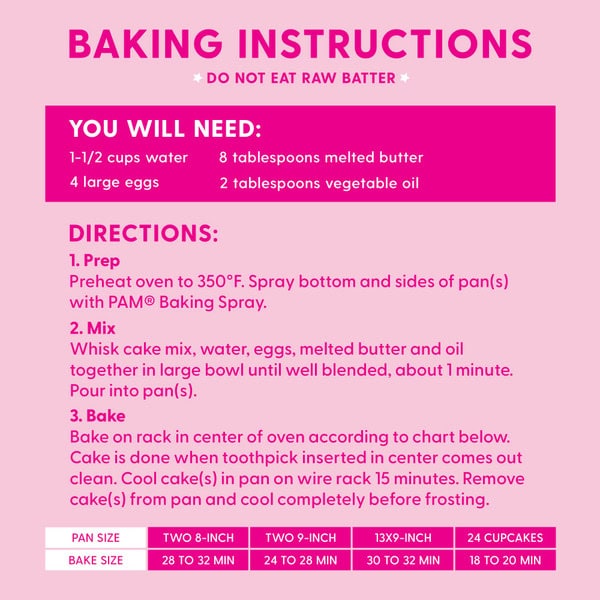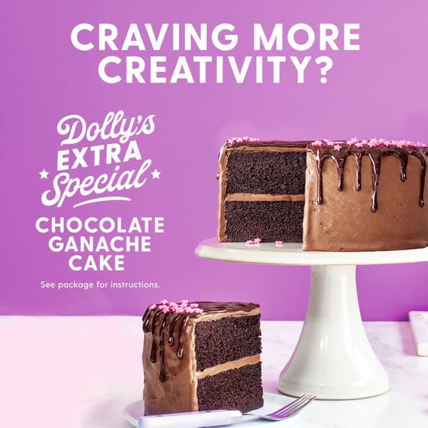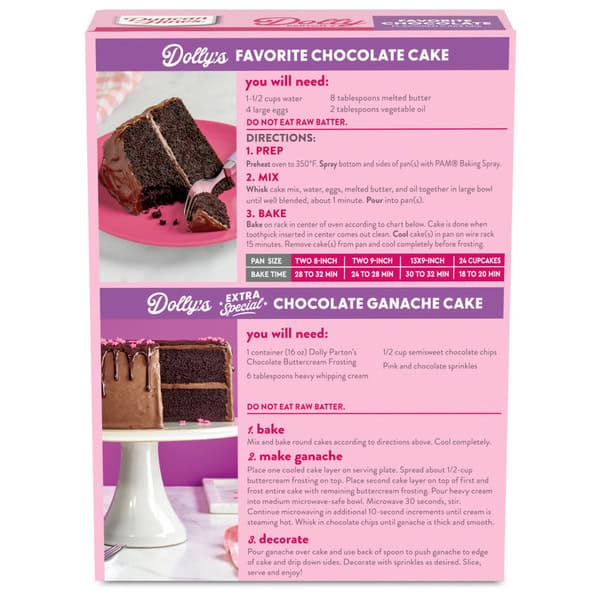 Dollys Favorite Chocolate Cake: You will need: 1-1/2 cups water; 4 large eggs; 8 tablespoon melted butter; 2 tablespoons vegetable oil. Directions: 1. Prep: Preheat oven to 350 degrees F. Spray bottom and sides of pan(s) with Pam Baking Spray. 2. Mix: Whisk cake mix, water, eggs, melted butter, and oil together in large bowl until well blended, about 1 minute. Pour into pan(s). 3. Bake: Bake on rack in center of oven according to chart below. Cake is done when toothpick inserted in center comes out clean. Cool cake(s) in pan on wire rack 15 minutes. Remove cake(s) from pan and cool completely before frosting. Pan size: Two 8-inch; Bake time: 28 to 32 min. Pan size: Two 9-inch; Bake time: 24 to 28 min. Pan size: 13×9-inch; Bake time: 30 to 32 min. Pan size: 24 cupcakes; Bake time: 18 to 20 min. Dolly’s Extra Special Chocolate Ganache Cake: You will need: 1 container (16 oz ) Dolly Parton’s Chocolate Buttercream Frosting. 6 tablespoons heavy whipping cream. 1/2 cup semisweet chocolate chips. pink and chocolate sprinkles. 1. Bake: Mix and bake round cakes according to directions above. Cool completely. 2. Make Ganache: Place one cooled cake layer on serving plate. Spread about 1/2-cup buttercream frosting on top. Place second cake layer on top of first and frost entire cake with remaining buttercream frosting. Pour heavy cream into medium microwave-safe bowl. Microwave 30 seconds, stir. Continue microwaving in additional 10-second increments until cream is steaming hot. Whisk in chocolate chips until ganache is thick and smooth. 3. Decorate: Pour ganache over cake and use back of spoon to push ganache to edge of cake and drip down sides. Decorate with sprinkles as desired. Slice, serve and enjoy! Do not eat raw batter.