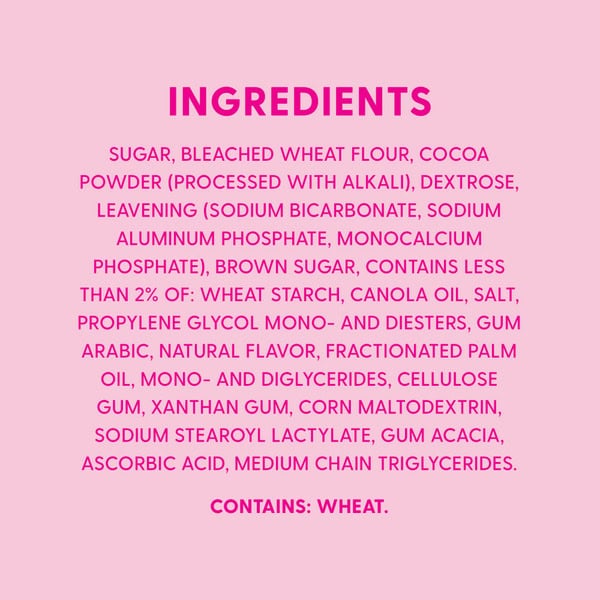 Sugar, Bleached Wheat Flour, Cocoa Powder (processed With Alkali), Dextrose, Leavening (sodium Bicarbonate, Sodium Aluminum Phosphate, Monocalcium Phosphate), Brown Sugar, Contains Less Than 2% Of: Wheat Starch, Canola Oil, Salt, Propylene Glycol Mono-and Diesters, Gum Arabic, Natural Flavor, Fractionated Palm Oil, Mono- And Diglycerides, Cellulose Gum, Xanthan Gum, Corn Maltodextrin, Sodium Stearoyl Lactylate, Gum Acacia, Ascorbic Acid, Medium Chain Triglycerides