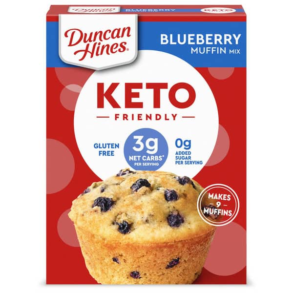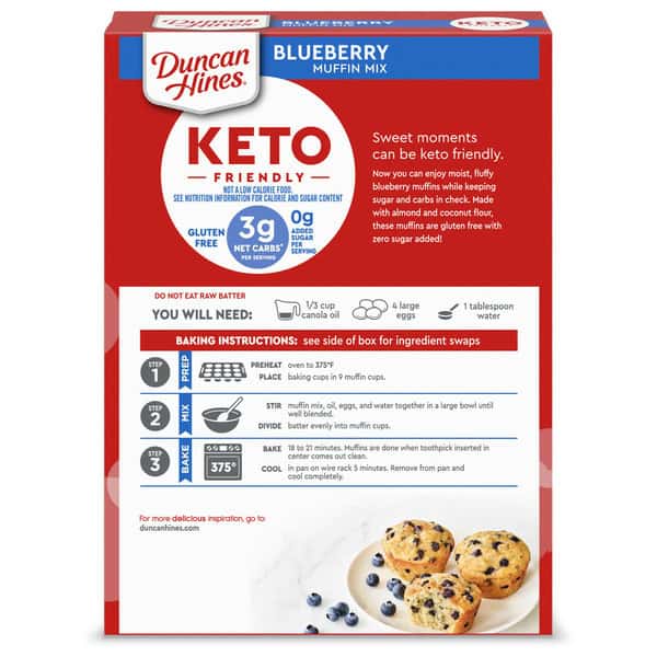 Duncan Hines Keto Friendly Blueberry Muffin Mix makes delicious muffins that fit your lifestyle. Loaded with fruity flavor, these blueberry muffins are made with almond and coconut flours, real blueberries and stevia for a delightful keto friendly start to your day. These naturally gluten free muffins contain only 3 grams of net carbs* and 0 grams of sugar** per serving. Simply add water, eggs and oil to the baking mix, stir to combine and bake for the recommended time in the instructions. Prepare this muffin mix to make keto muffins for a quick breakfast any day of the week or use it to make mini muffins for sweet snacks after school. These keto breakfast muffins help you feel good about the baked goods you serve. Each package makes 9 muffins. From breakfasts to just-because sweet treats, Duncan Hines has you covered when you’re ready to bake and create. Skip the sugar, not the sweets!