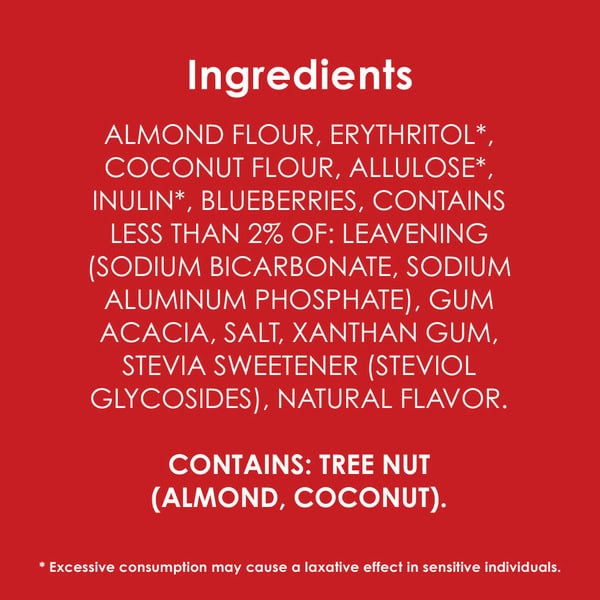 Almond Flour, Erythritol*, Coconut Flour, Allulose*, Inulin*, Blueberries, Contains Less Than 2% Of: Leavening (sodium Bicarbonate, Sodium Aluminum Phosphate), Gum Acacia, Salt, Xanthan Gum, Stevia Sweetener (steviol Glycosides), Natural Flavor.