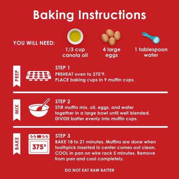 You Will Need: 1/3 cup Canola oil, 4 Large eggs, 1 Tablespoon water. Baking Instructions: See side of box for ingredient swaps. Step 1. Prep: Preheat oven to 375 degrees F. Place baking cups in 9 muffin cups. Step 2. Mix: Stir muffin mix, oil, eggs, and water together in a large bowl until well blended. Divide batter evenly into muffin cups. Step 3. Bake: Bake 18 to 21 minutes. Muffins are done when toothpick inserted in center comes out clean. Cool in pan on wire rack 5 minutes. Remove from pan and cool completely. Try These Ingredients Swaps: Replace 1/3 cup canola oil with: 1/3 cup melted coconut oil, melted butter, avocado oil, or plain Greek yogurt. Do not eat raw batter.