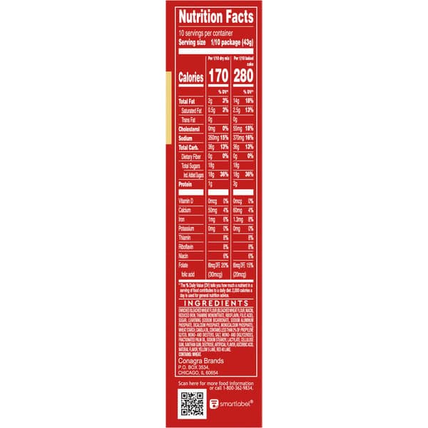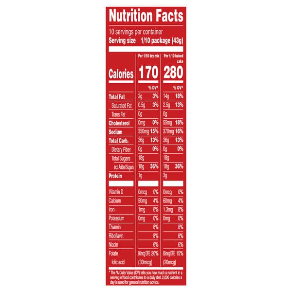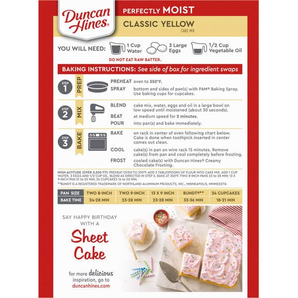 Per 1/10 Package: 180 calories; 2.5 g sat fat (13% DV); 350 mg sodium (15% DV); 18 g total sugars. See nutritional facts for as baked information. Perfectly moist. Say happy birthday with a sheet cake. www.duncanhines.com. how2recycle.info. SmartLabel: Scan or call 1-800-362-9834 for more food information. Questions or comments, visit us at www.duncanhines.com or call Mon.-Fri., 1-800-362-9834 (except national holidays). Please have entire package available when you call so we may gather information off the label. For more delicious inspirations, go to duncanhines.com.