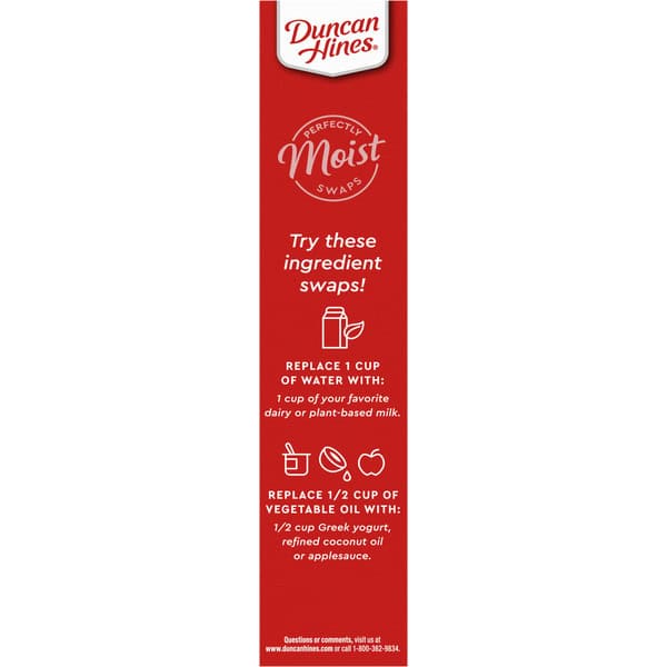 You Will Need: 1 cup water; 3 large eggs; 1/2 cup vegetable oil. Do not eat raw batter. Baking Instructions: See side of box for ingredient swaps. Step 1. Prep: Preheat oven to 350 degrees F. Spray bottom and sides of pan(s) with Pam Baking Spray. Use baking cups for cupcakes. Step 2. Mix: Blend cake mix, water, eggs and oil in a large bowl on low speed until moistened (about 30 seconds). Beat at medium speed for 2 minutes. Pour into pan(s) and bake immediately. Step 3. Bake: Bake on rack in center of oven following chart below. Cake is done when toothpick inserted in center comes out clean. Cool cake(s) in pan on wire rack 15 minutes. Remove cake(s) from pan and cool completely before frosting. Frost cooled cake(s) with Duncan Hines Creamy Chocolate Frosting. High Altitude (Over 3,500 ft): Preheat oven to 350 degrees F. Add 2 tablespoons of flour into cake mix. Add 1 cup water, 3 eggs and 1/2 cup oil. Blend as directed in step 2. Bake at 350 degrees F. Two 8-inch pans 23 to 28 min; 13 x 9-inch pan 21 to 25 min; 24 cupcakes 16 to 20 min. Pan Size: Two 8-inch: 24-28 min bake time. Pan Size: Two 9-inch: 23-28 min bake time. Pan Size: 13 x 9-inch: 23-28 min bake time. Pan Size: Bundt**: 33-36 min bake time. Pan Size: 24 Cupcakes: 18-21 min bake time. ** Bundt is a registered trademark of Northland Aluminum Products, Inc., Minneapolis, Minnesota.