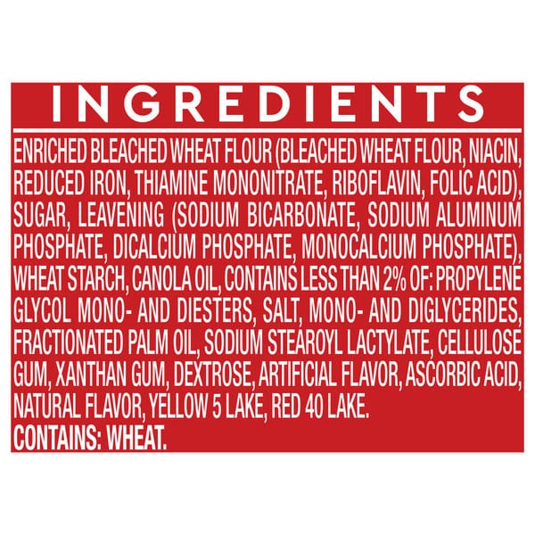 Enriched Bleached Wheat Flour (bleached Wheat Flour, Niacin, Reduced Iron, Thiamine Mononitrate, Riboflavin, Folic Acid), Sugar, Leavening (sodium Bicarbonate, Sodium Aluminum Phosphate, Dicalcium Phosphate, Monocalcium Phosphate), Wheat Starch, Canola Oil, Contains Less Than 2% Of: Propylene Glycol Mono- And Diesters, Salt, Mono- And Diglycerides, Fractionated Palm Oil, Sodium Stearoyl Lactylate, Cellulose Gum, Xanthan Gum, Dextrose, Artificial Flavor, Ascorbic Acid, Natural Flavor, Yellow 5 Lake, Red 40 Lake