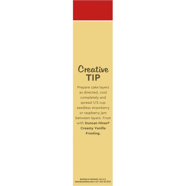 Creative Tip: Prepare cake layers as directed, cool completely and spread 1/2 cup seedless strawberry or raspberry jam between layers. Frost with Duncan Hines Creamy Vanilla Frosting.
