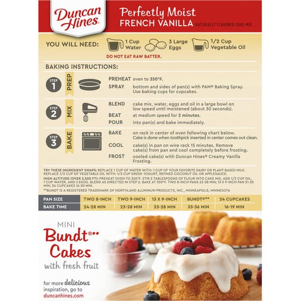 You Will Need: 1 cup water; 3 large eggs; 1/2 cup vegetable oil. Baking Instructions: Step 1: Prep: Preheat oven to 350 degrees F. Spray bottom and sides of pan(s) with Pam Baking Spray. Use baking cups for cupcakes. Step 2: Mix: Blend cake mix, water, eggs and oil in a large bowl on low speed until moistened (about 30 seconds). Beat at medium speed for 2 minutes. Pour into pan(s) and bake immediately. Step 3: Bake: Bake on rack in center of oven following chart below. Cake is done when toothpick inserted in center comes out clean. Cool cake(s) in pan on wire rack 15 minutes. Remove cake(s) from pan and cool completely before frosting. Frost cooled cake(s) with Duncan Hines Creamy Vanilla Frosting. Try these ingredient swaps: replace 1 cup of water with: 1 cup of your favorite dairy or plant-based milk. Replace 1/2 cup of vegetable oil with: 1/2 cup greek yogurt, refined coconut oil or applesauce. High altitude (over 3,500 ft): preheat oven to 350 degrees F. Stir 2 tablespoons of flour into cake mix, add 1/2 cup oil, 1 cup water, and 3 eggs. Blend as directed in step 2. Bake at 350 degrees F. Two 8-inch pans 23-28 min; 13 x 9-inch pan 21-25 min; 24 cupcakes 16-20 min. Pan Size: Two 8-inch; 24-28 min bake time. Two 9-inch; 22-27 min bake time. 13 x 9-inch; 21-26 min bake time. Bundt**; 33-36 min bake time. 24 cupcakes; 16-19 min bake time. ** Bundt is a registered trademark of Northland Aluminum Products, Inc. Minneapolis Minnesota. Do not eat raw batter.
