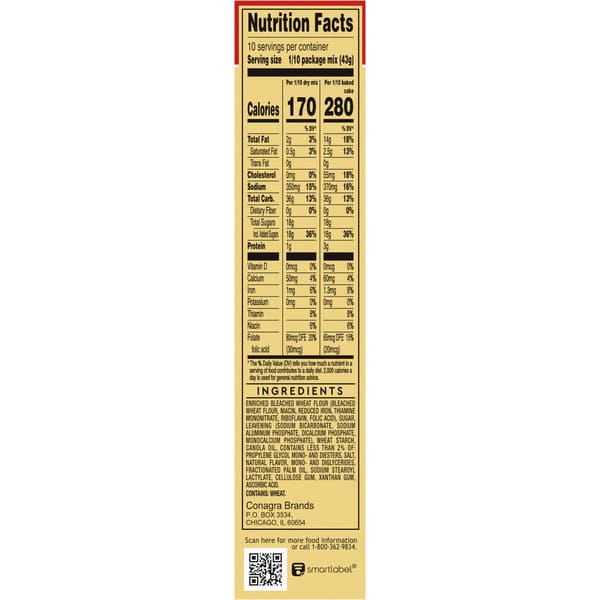 Made with real vanilla bean. Naturally flavored cake mix. Per 1/10 package: 180 calories; 2.5g sat fat (13%DV); 350mg sodium (15%DV); 18g total sugars. See nutrition facts for as baked information. Better than a trip to Paris. www.duncanhines.com. how2recycle.info. SmartLabel. Scan or call 1-800-362-9834 for more food information. Questions or comments, visit us at www.duncanhines.com or call Mon. -Fri, 1-800-362-9834 (except national holidays). Please have entire package available when you call so we may gather information off the label. For more delicious inspiration, go to duncanhines.com. Mini Bundt (Bundt is a registered trademark of northland aluminum products, Inc. Minneapolis, Minnesota) Cakes with fresh fruit.
