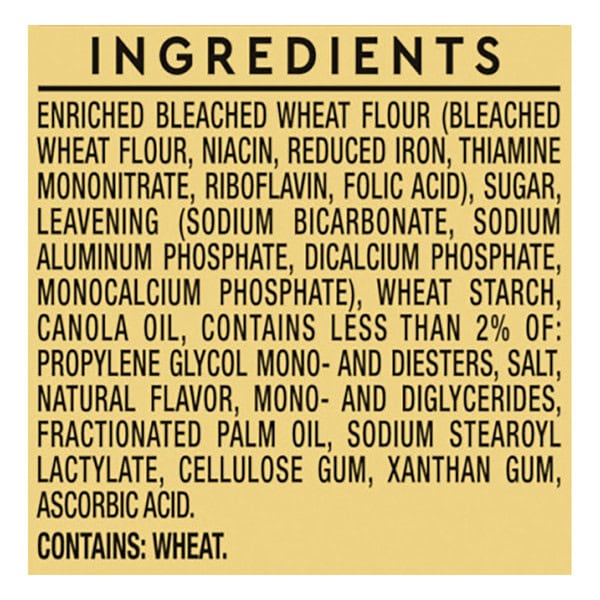 Sugar, Enriched Bleached Wheat Flour (wheat Flour, Niacin, Reduced Iron, Thiamine Mononitrate, Riboflavin, Folic Acid, Emulsified Palm Shortening (palm Oil, Propylene Glycol Mono- And Diesters Of Fats And Fatty Acids, Mono And Diglycerides, Sodium Stearoyl Lactylate), Leavening (sodium Bicarbonate, Sodium Aluminum Phosphate, Dicalcium Phosphate, Monocalcium Phosphate Monohydrate), Wheat Starch, Salt, Natural And Artificial Flavors, Cellulose Gum, Artificial Flavors, Xanthan Gum.