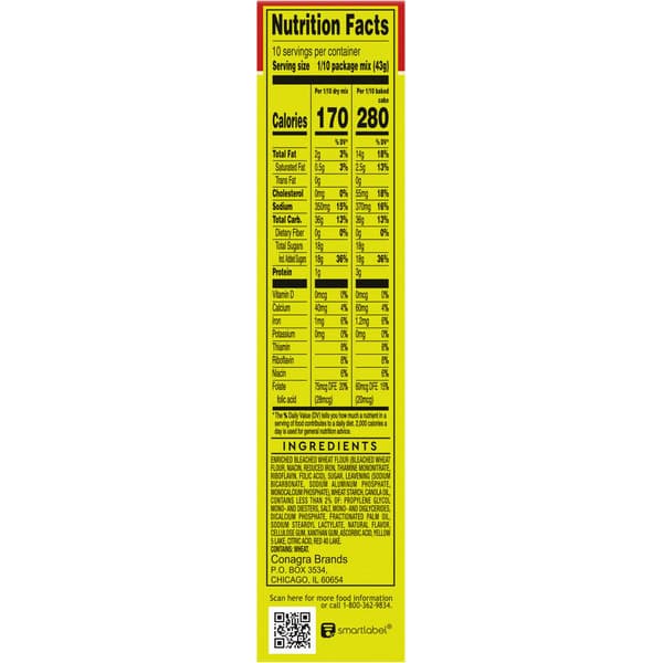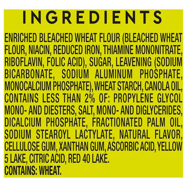 Enriched Bleached Wheat Flour (bleached Wheat Flour, Niacin, Reduced Iron, Thiamine Mononitrate, Riboflavin, Folic Acid), Sugar, Leavening (sodium Bicarbonate, Sodium Aluminum Phosphate, Monocalcium Phosphate), Wheat Starch, Canola Oil, Contains Less Than 2% Of: Propylene Glycol Mono-and Diesters, Salt, Mono- And Diglycerides, Dicalcium Phosphate, Fractionated Palm Oil, Sodium Stearoyl Lactylate, Natural Flavor, Cellulose Gum, Xanthan Gum, Ascorbic Acid, Yellow 5 Lake, Citric Acid, Red 40 Lake.