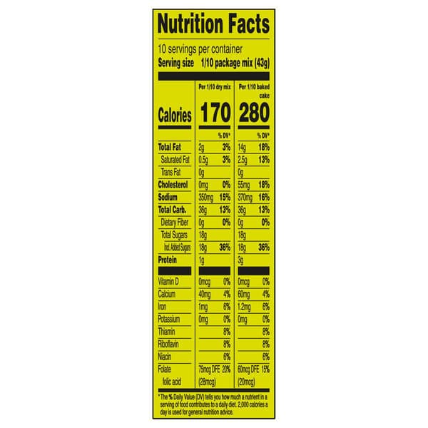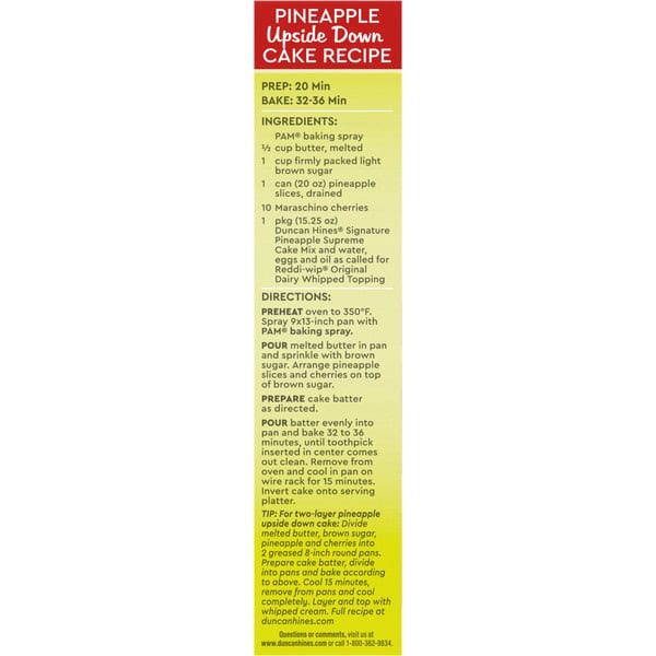 Naturally flavored. Per 1/10 Package: 180 calories; 2.5 g sat fat (13%DV); 350 mg sodium (15%DV); 18 g total sugars. See nutrition facts for as baked information. Made with pineapple juice and other natural flavors. Be a pineapple stand tall, wear a crown, & be sweet on the inside. www.duncanhines.com. how2recycle.info. SmartLabel: Scan or call 1-800-362-9834 for more food information. Questions or comments, visit us at www.duncanhines.com or call Mon. – Fri., 1-800-362-9834 (Except national holidays). Please have entire package available when you call so we may gather information off the label. For more delicious inspiration, go to duncanhines.com.