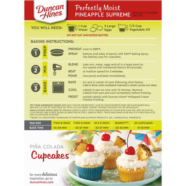 You Will Need: 1 cup water; 3 large eggs; 1/2 cup vegetable oil. Do not eat raw batter. Baking Instructions: Step 1 Prep: Preheat oven to 350 degrees F. Spray bottom and sides of pan(s) with Pam baking spray. Use baking cups for cupcakes. Step 2 Mix: Blend cake mix, water, eggs and oil in a large bowl on low speed until moistened (about 30 seconds). Beat at medium speed for 2 minutes. Pour into pan(s) and bake immediately. Step 3 Bake: Bake on rack in center of oven following char below. Cake is done when toothpick inserted in center comes out clean. Cool cake(s) in pan on wire rack 15 minutes. Remove cake(s) from pan and cool completely before frosting. Frost cooled cake(s) with Duncan Hines Whipped Cream Cheese Frosting. Try These Ingredient Swaps: Replace 1 cup of water with: 1 cup of your favorite dairy or plant-based milk. Replace 1/2 cup of vegetable oil with: 1/2 cup Greek yogurt, refined coconut oil or applesauce. High Altitude (Over 3,500 ft): Preheat oven to 350 degrees F. Stir 2 tablespoons of flour into cake mix, add 1/2 cup oil, 1 cup water, and 3 eggs. Blend as directed in step 2. Bake at 350 degrees F. Two 8-inch pans 23-28 min; 13 x 9-inch pan 21-25 min; 24 cupcakes 16-20 min. Pan Size: Two 8-inch; Bake Time: 24-28 min. Pan Size: Two 9-inch; Bake Time: 22-27 min. Pan Size: 13 x 9-inch; Bake Time: 22-27 min. Pan Size: Bundt**; Bake Time: 33-36 min. Pan Size: 24 cupcakes; Bake Time: 15-18 min. ** Bundt is a registered trademark of Northland Aluminum Products, Inc., Minneapolis, Minnesota.