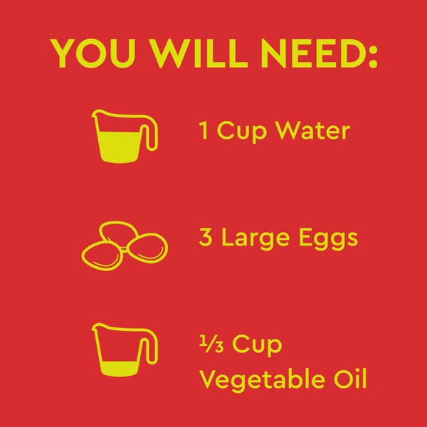 You Will Need: 1 cup water; 3 large eggs; 1/3 cup vegetable oil. Do not eat raw batter. Baking Instructions: Step (1) Prep: Preheat oven to 350 degrees F for metal and glass pan(s), 325 degrees F for dark or coated pan(s) (Add 3-5 minutes to bake time for dark or coated pan(s). Cake is done when toothpick inserted in center comes out clean). Grease sides and bottom of pan(s) and flour lightly. Use baking cups for cupcakes. Step (2) Mix: Blend cake mix, water, oil and eggs in a large bowl at low speed until moistened (about 30 seconds). Beat at medium speed for 2 minutes. Pour batter in pan(s) and bake immediately. Step (3) Bake: Bake in center of oven following chart below. Cool cake(s) in pan on wire rack for 15 minutes. Remove cake(s) from pan and cool completely before frosting. Lower Fat Recipe: Prepare and bake following the directions above except using 3/4 cup water, 1/3 cup unsweetened applesauce and 3 eggs. High Altitude (Over 3,500 ft): Preheat oven to 350 degrees F. Stir 2 tablespoons of flour into cake mix, add 1/3 cup oil, 1 cup water, and 3 eggs. Blend as directed in step 2. Bake at 350 degrees F. Two 8-ich pans 23-28 min; 13 x 9-inch pan baked 21-24 min; 24 cupcakes 16-20 min. Pan Size: Two 8-inch; 23-28 min bake time; Pan Size: Two 9-inch; 22-27 min bake time; Pan Size: 13 x 9-inch; Bake Time: 22-27 min; Pan Size: Bundt (Bundt is a registered trademark of northland aluminum products, inc, Minneapolis, Minnesota) Bake Time: 33-36 min; Pan Size: 24 cupcakes; 15-18 min.