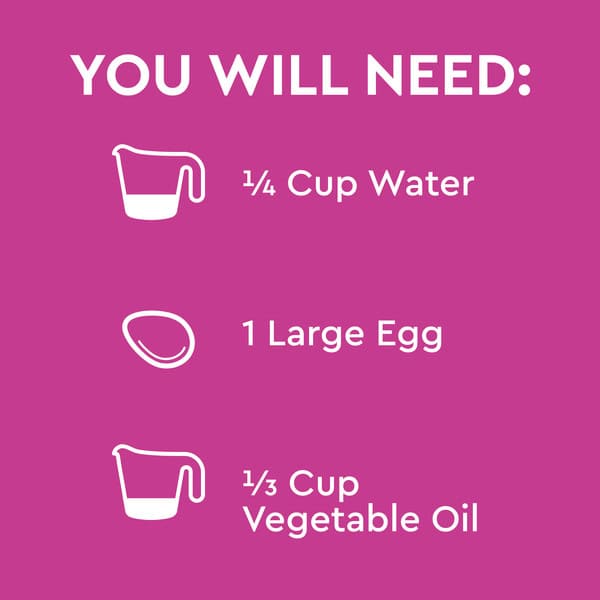 You Will Need: 1 large egg; 1/3 cup vegetable oil; 1/4 cup water. Do not eat raw batter. Baking Instructions: Step 1. Prep: Preheat oven to 350 degrees F. Spray bottom of pan with PAM. Step 2. Mix: Stir brownie mix, egg, oil, and water together in a large bowl until well blended, about 50 strokes. Spread into greased pan and bake immediately. Step 3. Bake: Bake on rack in center of oven following chart below. Add 3-5 minutes for glass pan. Brownie is done when toothpick inserted 1-inch from the edge of pan comes out clean. Cool completely in pan on wire rack before cutting and serving. For Cake-Like Brownies: Use 2 eggs, 2 tablespoons water and ¼ cup oil. Mix according to the directions in step 2 and bake according to chart below. High Altitude: Preheat oven to 350 degrees F. Stir 2 tablespoons flour into brownie mix. Mix according to the directions in step 2. Bake at 8 x 8 inch pan 35 to 37 min; 9 x 9 inch pan 30 to 32 min. Pan Size: 8 x 8 inch; Bake time: 33 – 36 min. Pan Size: 9 x 9 inch; Bake Time: 27 – 30 min. Quick Tip: Refrigerate brownies for 30 minutes before cutting for the neatest squares.