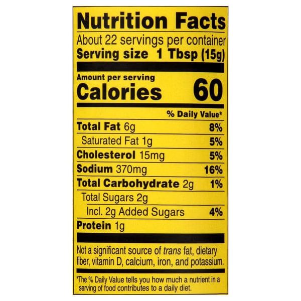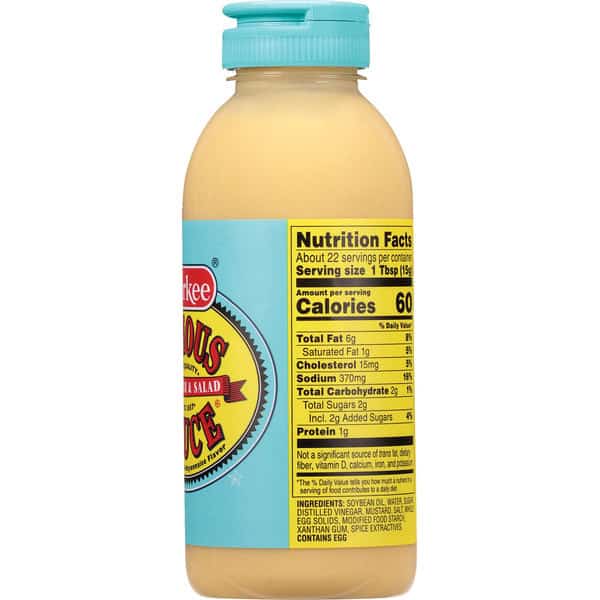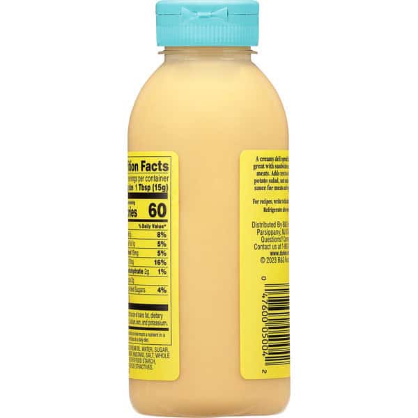 Soybean Oil, Water, Distilled Vinegar, Sugar, Mustard, Salt, Whole Egg Solids, Food Starch-modified, Xanthan Gum, Spice Extractives.