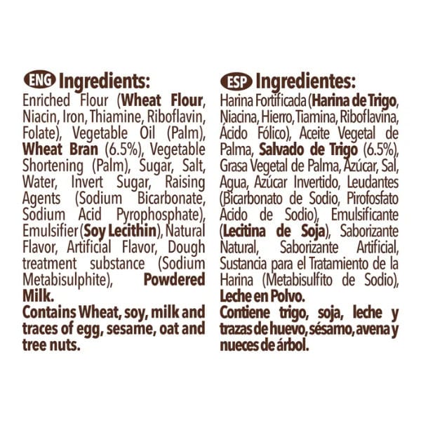 Wheat, Enriched Flour (Whole Wheat Flour (80%), Niacin, Iron, Thiamine, Riboflavin, Folic Acid), Vegetable Oil Palm, Vegetable Shortening Palm, Sesame Seeds, Salt, Invert Sugar, Wheat Fiber (0.8%), Water, Oat Fiber (0.5%), Leavenings (Sodium Bicarbonate, Monocalcium Phosphate, Ammonium Bicarbonate), Yeast, Yeast Food, Milk, Emulsifier (Soy Lecithin), Acidulant (Lactic Acid), Hydrolytic And Amylolytic Enzyme.