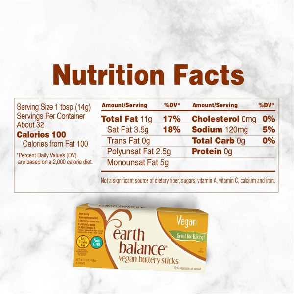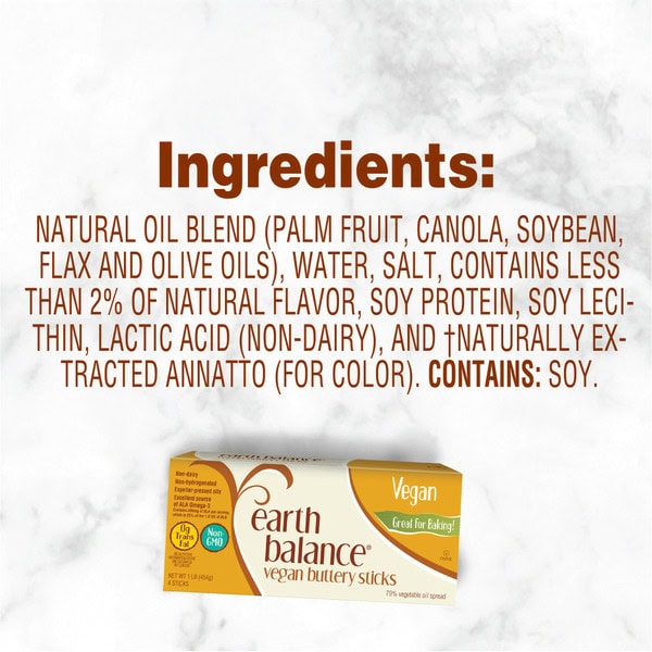 Earth Balance Vegan Buttery Sticks are a plant-based butter alternative that offers delicious buttery flavor in convenient butter sticks. This butter substitute is lactose free, non GMO and certified vegan, so you can enjoy rich, buttery flavor without compromise. Made with vegetable oils, this vegan butter alternative has 320 milligrams of omega-3 ALA per serving, which is 20% of the 1.6 g daily value for ALA. It’s vegan stick butter made with no hydrogenated or partially hydrogenated oils*. This creamy butter alternative is easy to use on all of your favorite foods. Use this butter spread substitute in your favorite baked goods for vegan baking with buttery flavor. It’s delicious on toast, hot muffins, vegetables and more. These salted buttery sticks come in a convenient one pound pack with four sticks for easy storage in the refrigerator. Earth Balance is committed to food that’s not just good for cooking, baking, snacking, and spreading, it’s made with the Earth in mind.