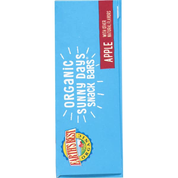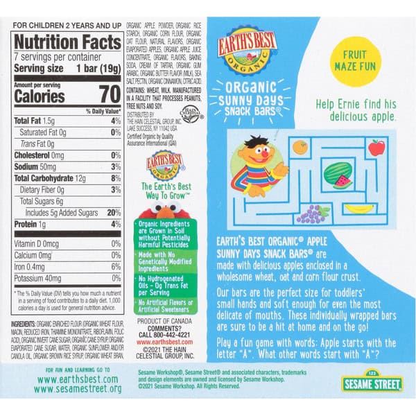 Crafted with real organic apples. Yummy & tasty. The Earth’s Best Way to Grow: Organic ingredients are grown in soil without potentially harmful pesticides. Fruit maze fun. Help Ernie find his delicious apple. Earth’s Best Organic apple sunny days snack bars are made with delicious apples enclosed in a wholesome wheat, oat and corn flour crust. Our bars are the perfect size for toddlers small hands and soft enough for even the most delicate of mouths. These individually wrapped bars are sure to be a hit at home and on the go!