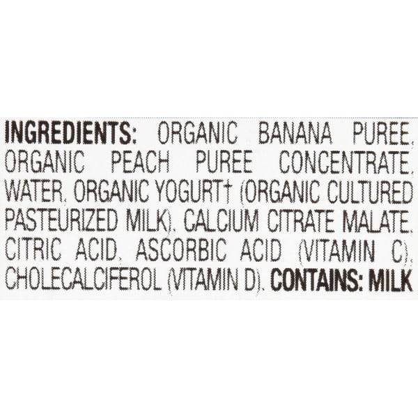 Organic Banana Puree, Organic Peach Puree Concentrate, Water, Organic Yogurt†(organic Cultured Pasteurized Milk), Calcium Citrate, Citric Acid, Ascorbic Acid (vitamin C), Cholecalciferol (vitamin D), †Heat Treated After Culturing