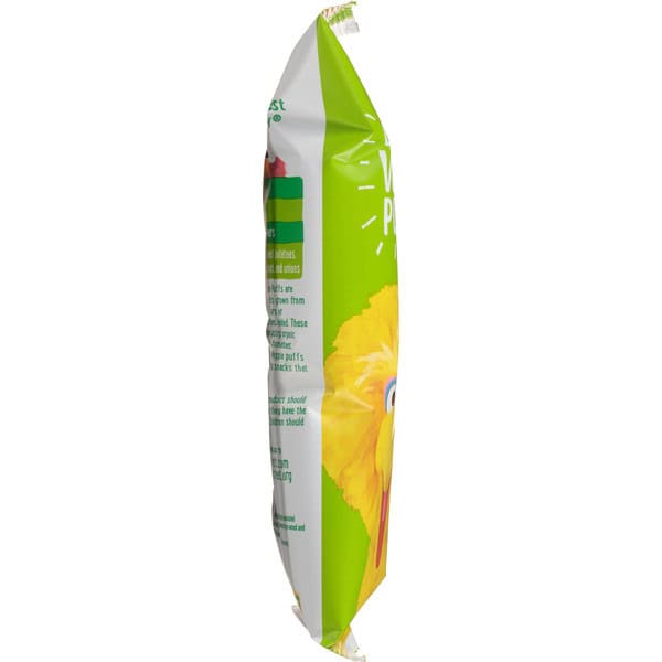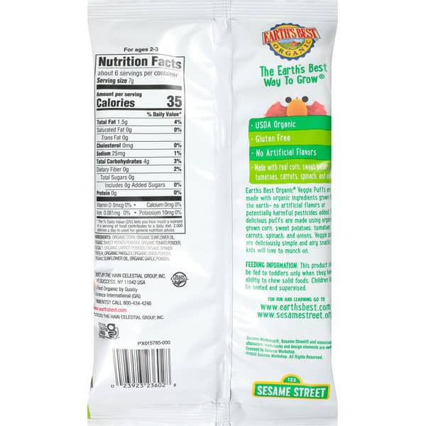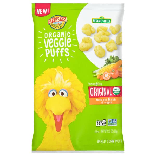 Toddler USDA Organic. www.earthsbest.com; www.sesamestreet.org 800-434-4246 Earth’s Best Organic Veggie Puffs are made with organic ingredients grown from the earth–no artificial flavors or potentially harmful pesticides added. These delicious puffs are made using organic grown corn, sweet potatoes, tomatoes, carrots, spinach, and onions. Veggie puffs are deliciously simple and airy snacks that kids will love to munch on.