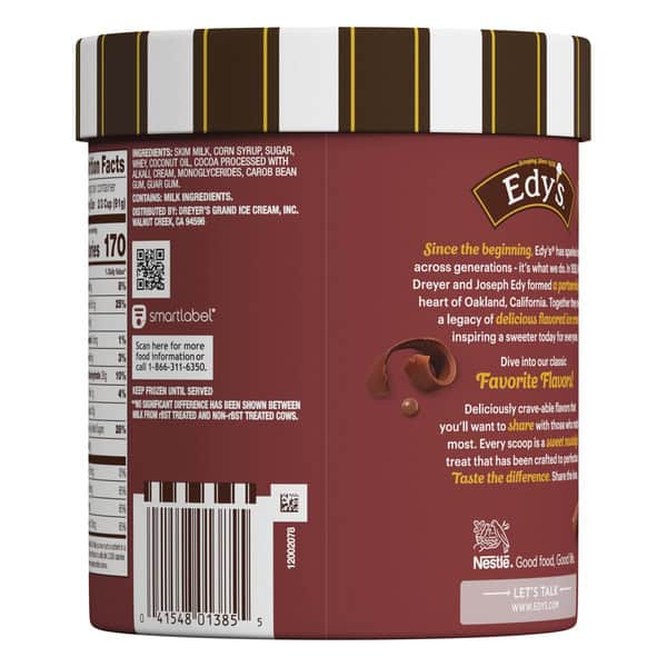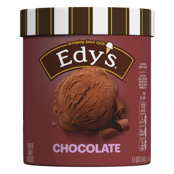 Edy’s/Dreyer’s Chocolate makes any occasion extra special. A delicious frozen treat that is also the perfect creamy base for yummy toppings like cookie pieces, this original has a melt-in-your-mouth texture that’s easy to scoop. No artificial colors or flavors and no rBST used.* This frozen dairy dessert is OU Kosher dairy certified. Deliciously crave-able, Edy’s/Dreyer’s Chocolate is a treat that you’ll want to share is with those who matter most. Every scoop has been crafted to sweet nostalgic perfection so don’t forget to share the love with the whole family. *Milk and cream from cows not treated with the growth hormone rBST. No significant difference has been shown between milk from rBST treated and non rBST treated cows.