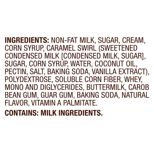Non-fat Milk, Sugar, Cream, Corn Syrup, Caramel Swirl (sweetened Condensed Milk [condensed Milk, Sugar], Sugar, Corn Syrup, Water, Coconut Oil, Pectin, Salt, Baking Soda, Vanilla Extract), Polydextrose, Soluble Corn Fiber, Whey, Mono And Diglycerides, Buttermilk, Carob Bean Gum, Guar Gum, Baking Soda, Natural Flavor, Vitamin A Palmitate.