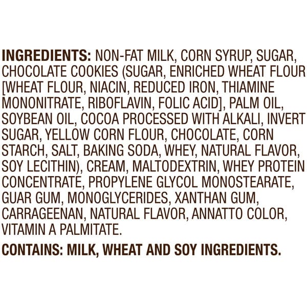 Non-fat Milk, Corn Syrup, Sugar, Chocolate Cookies (sugar, Enriched Wheat Flour [wheat Flour, Niacin, Reduced Iron, Thiamine Mononitrate, Riboflavin, Folic Acid], Palm Oil, Soybean Oil, Cocoa Processed With Alkali, Invert Sugar, Yellow Corn Flour, Chocolate, Corn Starch, Salt, Baking Soda, Whey, Natural Flavor, Soy Lecithin), Cream, Maltodextrin, Whey Protein Concentrate, Propylene Glycol Monostearate, Guar Gum, Monoglycerides, Xanthan Gum, Carrageenan, Natural Flavor, Annatto Color, Vitamin A Palmitate.