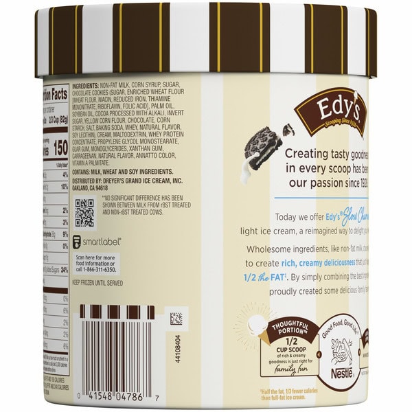 Discover a creamy, delicious treat with 1/2 the fat and 1/3 fewer calories than full-fat ice cream with Edy’s/Dreyer’s Slow Churned Cookies and Cream Light Ice Cream. Don’t be fooled by less fat and fewer calories, this light ice cream has all the creamy goodness of regular ice cream! Containing no artificial colors or flavors, this ice cream is also OU Kosher dairy certified and is made with milk and cream from cows not treated with the growth hormone rBST*. Long summer days are finally stretching into golden evenings. Celebrate by topping them off with this family favorite: fun and delicious cookies and cream light ice cream made with fresh milk and cream. How do we make Slow Churned light ice cream with 1/3 fewer calories and 1/2 the fat but with all the creaminess and goodness of regular ice cream? We start with milk and cream and mix our special recipe for scoops of perfection every time! For nearly a hundred years, Edy’s/Dreyer’s has been dedicated to serving you and your families the richest, creamiest ice cream with real, high-quality ingredients the whole family can enjoy together. Today, we honor our legacy of reinvention and optimism, by celebrating the ways people remix in their everyday lives. Whether your Saturday nights are a bit out of the ordinary, or you like adding a little something extra to your dessert. At Edy’s/Dreyer’s, we respect the remix, and we’re right there with you. Remixing Since Forever.
